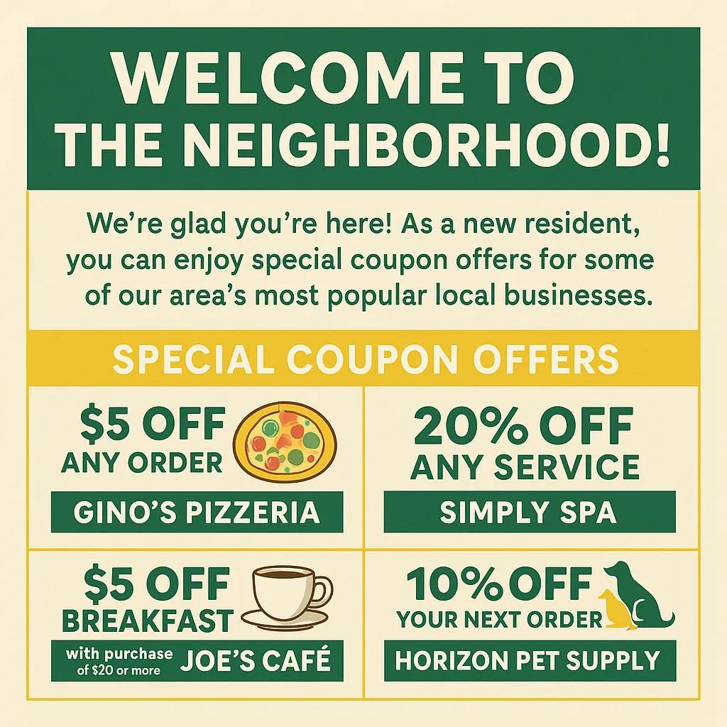 Your logo, contact info, and special offer featured on our monthly “Welcome to the Neighborhood” newsletter